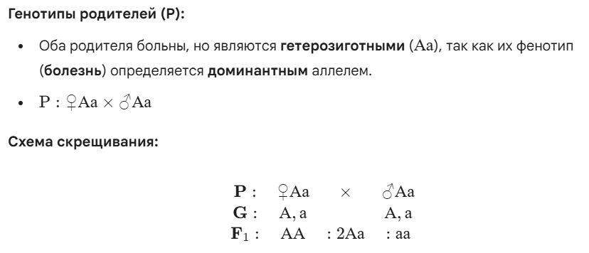 Добавить текст Озвучить Вернуть оригиналНаследственная болезнь, обусловленная доминантным геном (А), проявляется в каждом поколении. Здоровые дети (рецессивный признак) могут родиться только в том случае, если оба больных родителя являются гетерозиготными носителями.