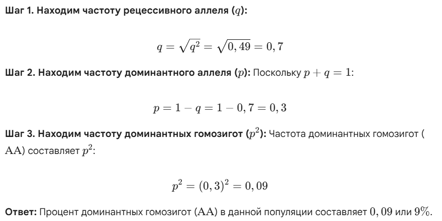 Добавить текст Озвучить Вернуть оригинал9. В популяции человека количество индивидуумов с карим цветом глаз составляет 51%, а с голубым — 49%. Определите процент доминантных гомозигот в данной популяции.