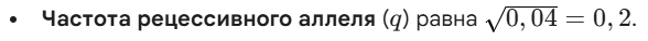 Частота рецессивной гомозиготы (аа) равна q2 = 0,04.
