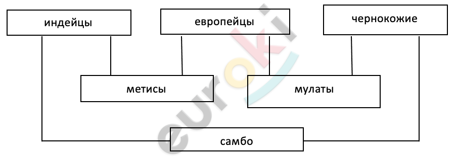 Добавить текст Вернуть оригинал11. Укажите на схеме, как называются потомки смешанных браков в Южной Америке.