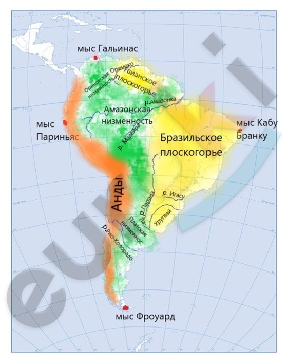 12. На контурную карту Южной Америки нанесите крайние точки и подпишите их, а также горы, равнины, реки и озера.