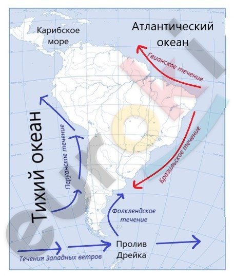 13. Подпишите на контурной карте океаны и моря, омывающие Южную Америку. Нанесите течения у ее берегов.