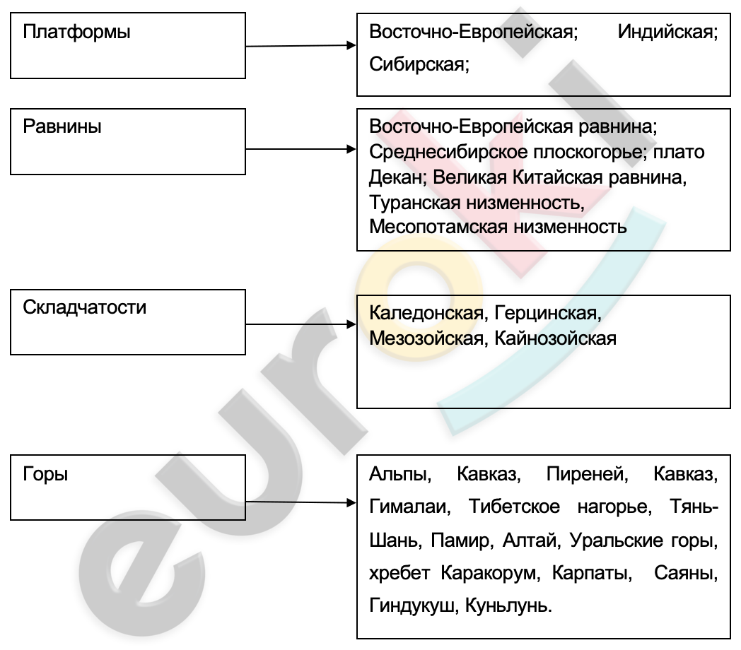 7. Используя карту (рис. 24) на с. 37 учебника и физическую карту Евразии, заполните схему.