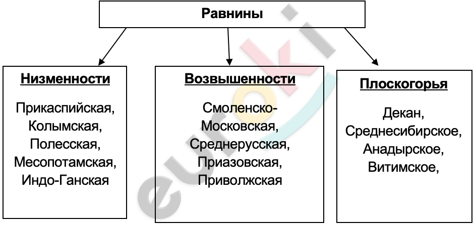 8. Составьте схему «Различие равнин Евразии по высоте». Сопроводите ее несколькими примерами по каждому виду равнин.