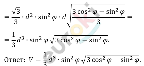 \[= \frac{2d^{2}\sin^{2}\varphi}{2 \bullet \sqrt{3}} = \frac{\sqrt{3}}{3} \bullet d^{2} \bullet \sin^{2}\varphi.\]