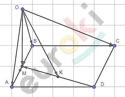 \[2)\ \overrightarrow{\text{OM}} = \overrightarrow{\text{OK}} + \overrightarrow{\text{KM}}\ \ и\ \ \]