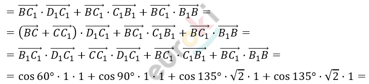 \[= \overrightarrow{BC_{1}} \cdot \left( \overrightarrow{D_{1}C_{1}} + \overrightarrow{C_{1}B_{1}} + \overrightarrow{B_{1}B} \right) =\]