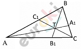 \[\frac{BA_{1}}{A_{1}C} = \frac{\text{BT}}{TB_{1}} \cdot \frac{B_{1}A}{\text{AC}}\text{\ \ \ \ }(2).\]