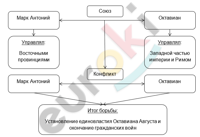 Добавить текст Вернуть оригинал2. Марк Антоний управлял восточными провинциями, Октавиан – западной частью империи и Римом.
