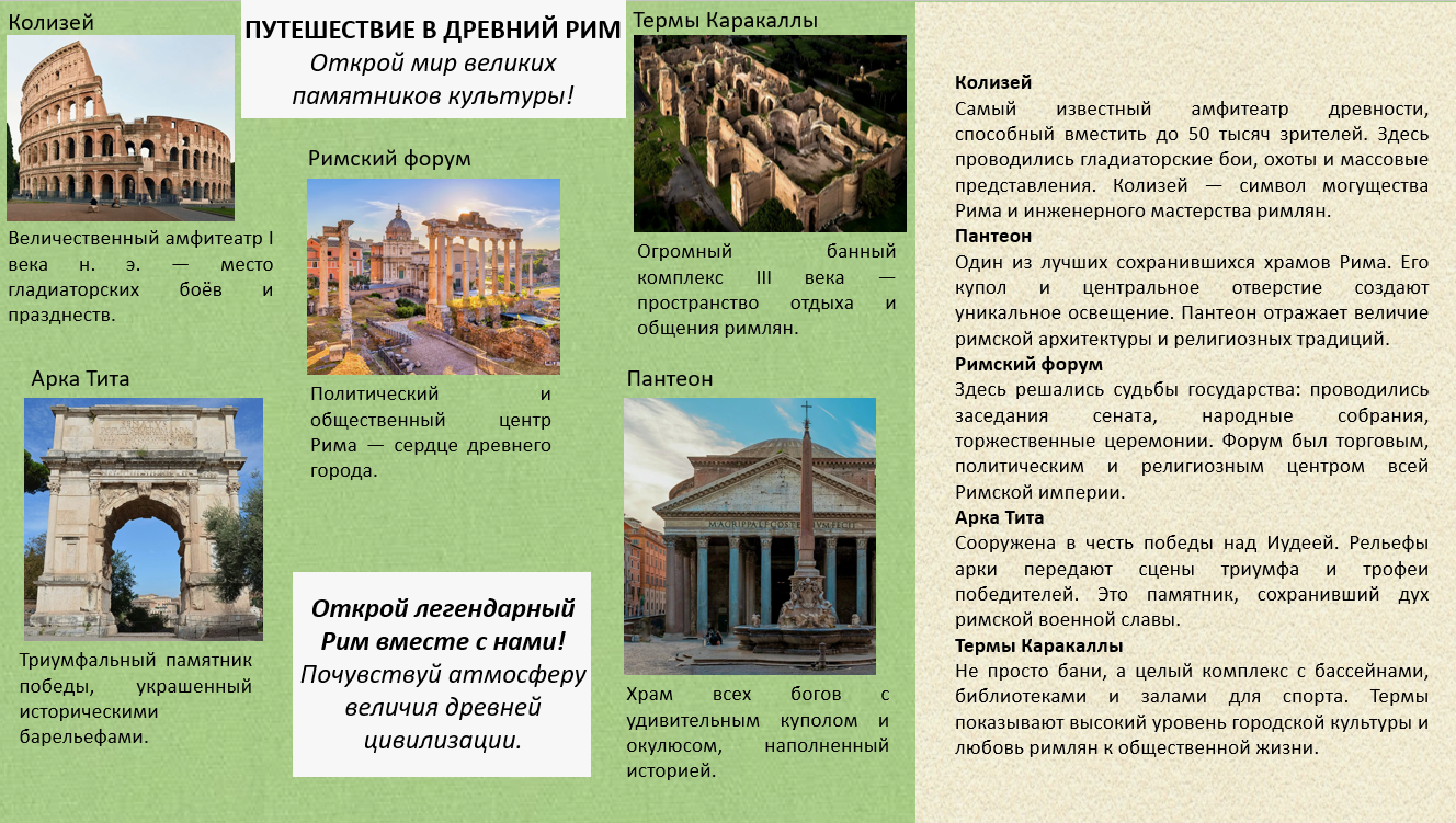 Мы узнали, что архитектура Древнего Рима отличается величием, практичностью и богатством форм: амфитеатры, форумы, храмы, бани и арки были важной частью жизни римлян и символами их цивилизации.