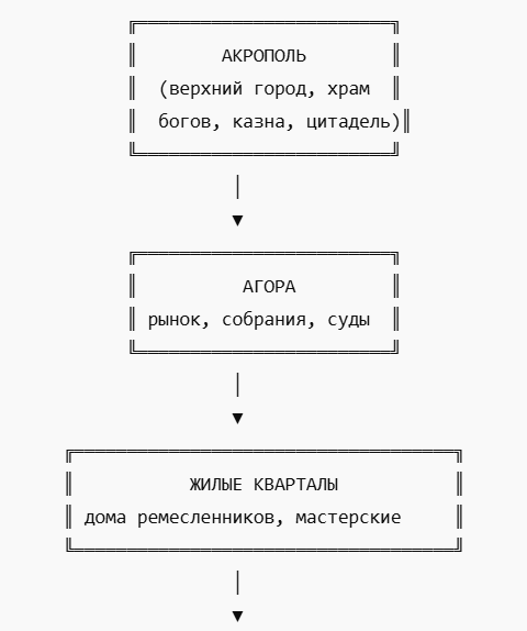 2. На основе текста параграфа нарисуйте схему типичного греческого полиса, обозначив на ней его основные части, такие как агора, акрополь, сельская округа и т. д.