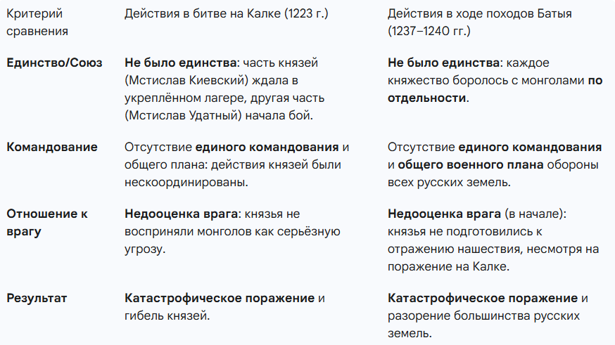 Добавить текст Вернуть оригинал5. Сравните действия русских князей в битве на Калке и в ходе походов Батыя. Какой вывод можно сделать из этого сравнения?
