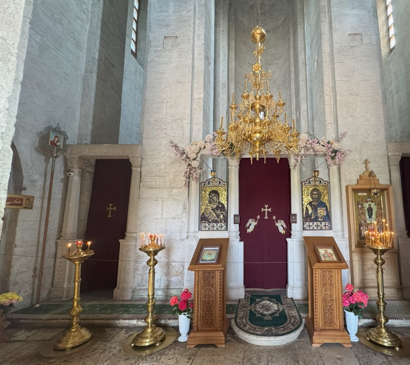Добавить текст Вернуть оригиналОсобая поэзия памятника — в резном камне. На фасадах — рельефы с царём Давидом, грифонами, львами, виноградной лозой и плетёнкой. Это не просто украшение: иконографический ряд соединяет византийские библейские мотивы с локальной звериной символикой, говоря о божественной мудрости, царском достоинстве и охране града. Белокаменная резьба здесь достигает редкой чистоты рисунка и тонкости света-тени.