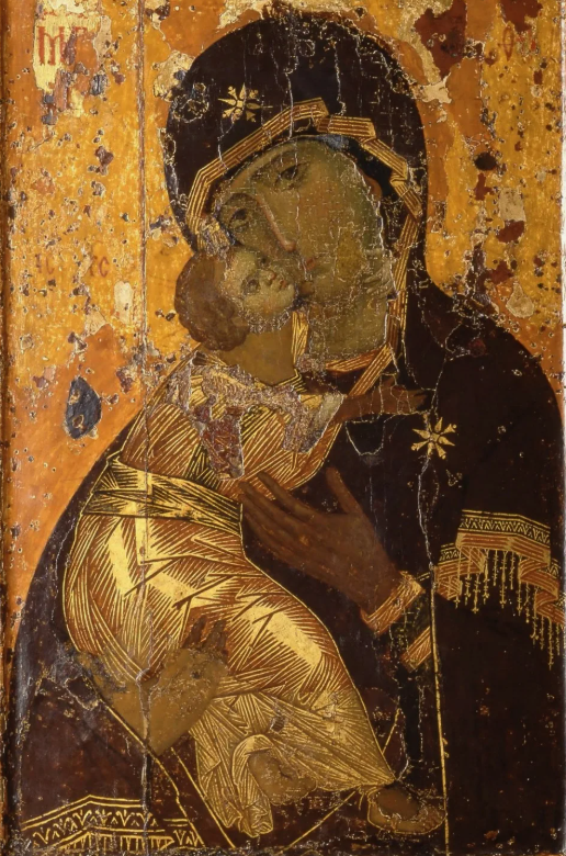 Во Владимиро-Суздальской земле XII–начала XIII века складывается свой вариант торжественной светоносности. Ключевым почитаемым образом становится «Владимирская Богоматерь» (первая треть XII века, византийского происхождения, но русский этап почитания преобразил её восприятие): мягкий оливковый колорит, тёплый свет ликов и глубина материнской любви стали для Руси эталоном типа «Умиление». На этой почве вырастает высокое княжеское искусство: праздничные «Успения», «Деисусные» ряды, строгие архангелы с удлинёнными пропорциями и мерной пластикой, созвучной белокаменным соборам.