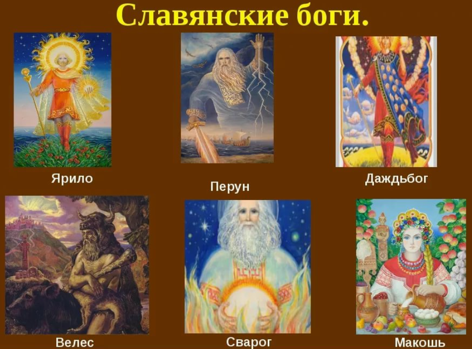 До принятия христианства мировоззрение восточных славян было языческим, политеистическим и тесно связанным с природой и хозяйственным календарём. Мир виделся населённым множеством сил — от верховных богов до духов мест, дома и стихий. В городах княжеской дружины особым почётом пользовались Перун — бог грома, войны и княжеской власти, и Велес — покровитель скота, достатка и поэзии; в некоторых землях почитали Сварога (небо и огонь), Даждьбога (солнце и плодородие), Стрибога (ветры), Макошь (женская доля, рукоделие). В разные племена приносили свои локальные культы и имена, поэтому единый пантеон существовал лишь условно и менялся от региона к региону.