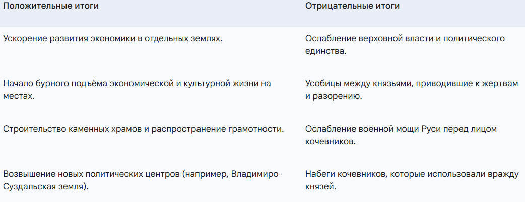 Добавить текст Вернуть оригинал4. Заполните в тетради таблицу «Последствия раздробленности Руси». Укажите в ней положительные и отрицательные итоги раздробленности.