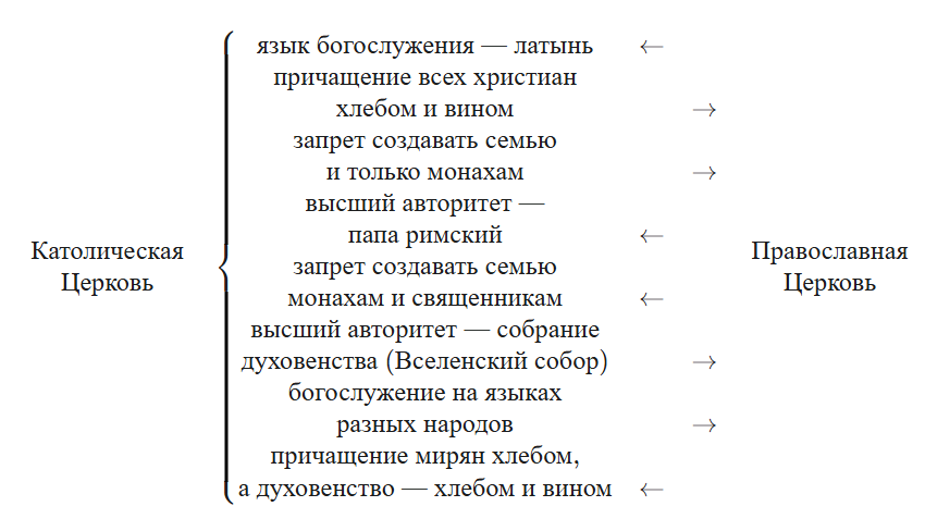 6. Выберите положения, характеризующие католическую или православную Церкви. Установите соответствие, обозначив связь на схеме стрелками.