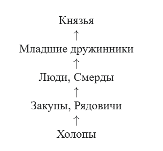 6. Заполните схему, используя термины: люди, холопы, князя, смерды, младшие дружинники, закупы и рядовичи.