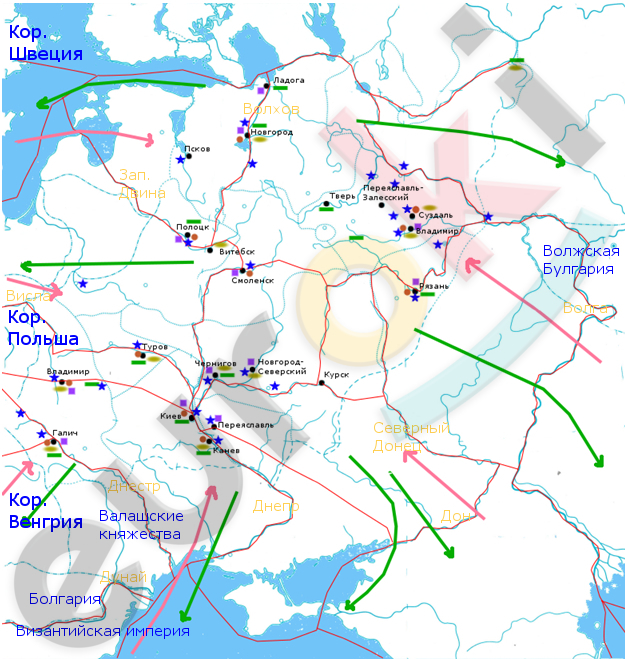 Торговые партнеры подписаны синим цветом – Византийская империя, Болгария, Венгрия, Валашские княжества, Польша, Швеция, Волжская Булгария, государства Кавказа, степные народы.