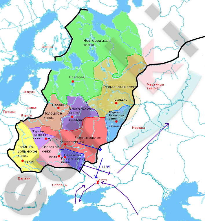 Походы князя Игоря Святославича показаны синими стрелками и подписана дата (1185).