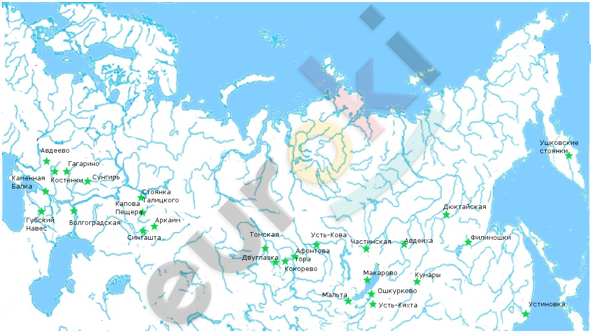 В учебнике названы следующие стоянки: Киик-Коба, Кобайский, Костёнки, Сунгир, Капова пещера, Денисова пещера, Афонтова гора, Буреть, Мальта.