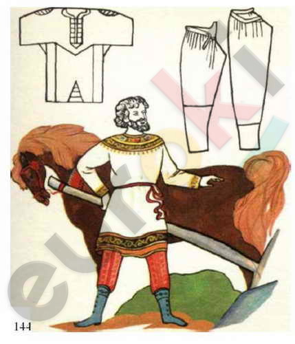 Добавить текст Вернуть оригиналКлиматические условия прямо повлияли на одежду жителей Руси. Летом жители Руси (мужчины) носили рубаху, порты и зипуны. Рубаху носили на выпуск и подпоясывали узким поясом или цветным шнуром. В особых случаях к рубахе надевали зарукавья и съемные круглые воротники-ожерелья, богато расшитые жемчугом и драгоценными камнями. Цвет основной ткани был разнообразный, но всегда яркий. Порты, или штаны, делали из холщовой ткани; они представляли собой неширокие, суженные книзу до щиколотки штаны, завязывающиеся на талии шнурком — гашником. Поверх них состоятельные люди носили еще верхние шелковые или суконные штаны, иногда на подкладке.