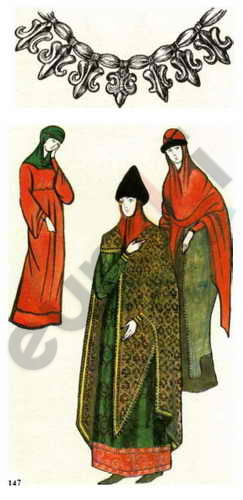 Верхний женский кафтан имел в отличие от мужского широкие рукава, из которых виднелись украшенные зарукавья нижней рубахи. Женская рубаха была длинной (до ступней). Ее носили с нешироким поясом, украшали орнаментом (обычно по низу). Горловину рубахи обшивали узкой каймой. В ассортимент женской одежды этого периода входят также понева — юбка, запахнутая по – верх рубахи на гашнике, запона — накладная, не сшитая по бокам одежда из холста, которую девушки носили поверх рубахи. Женская обувь, как и мужская, представлена у князей и бояр мягкими сапогами без каблуков из цветной кожи с вышитыми носочной и нижней частями, у крестьян — лаптями с онучами5.