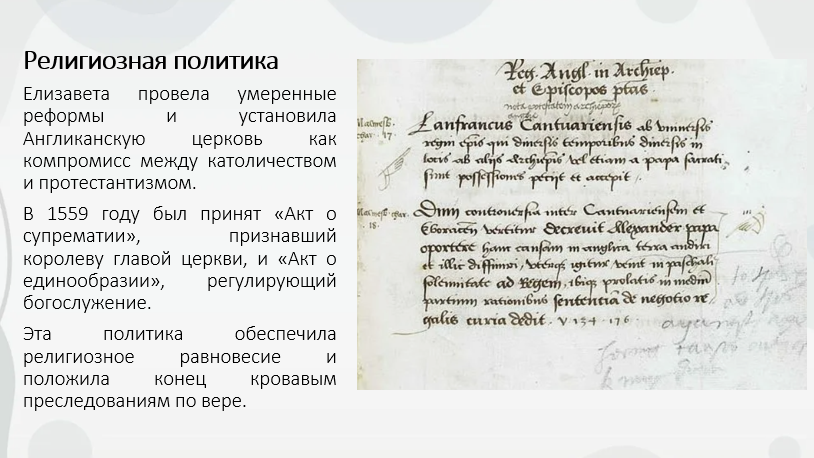 Добавить текст Вернуть оригиналОбоснование: Её способность, используя "новые политические средства" (прямое обращение к обществу) и пропаганду, объединить страну вокруг своей фигуры (культ королевы), несмотря на религиозные и социальные конфликты, была самой эффективной в истории Англии. Это позволило ей избежать гражданских войн и укрепить власть, не прибегая к дорогостоящим бюрократическому аппарату и армии, как во Франции.