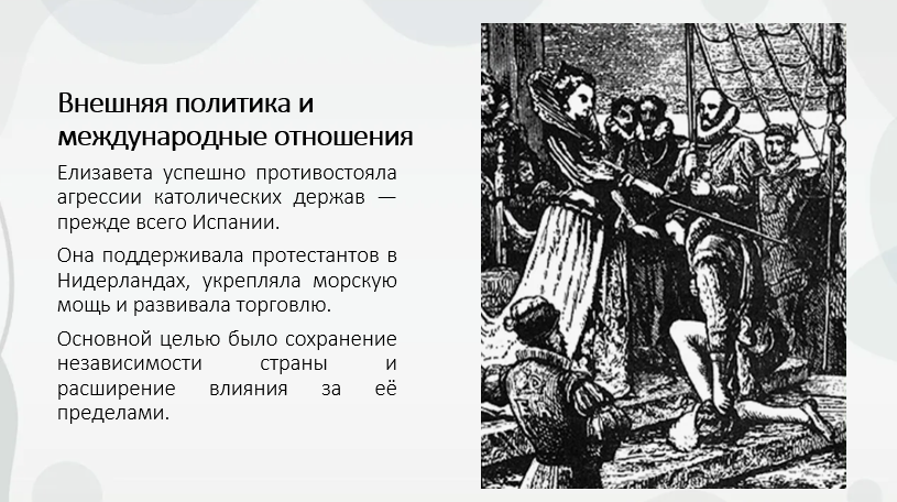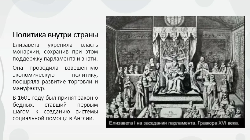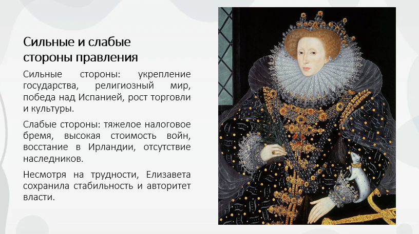 Используя дополнительные источники, подготовьте презентацию о правлении Елизаветы I. Выделите его сильные и слабые стороны.