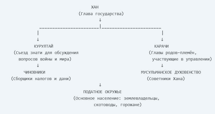 Золотая Орда распалась на следующие части: Крымское ханство, Казанское ханство, Астраханское ханство, Сибирское ханство, Ногайская Орда и Узбекское ханство.