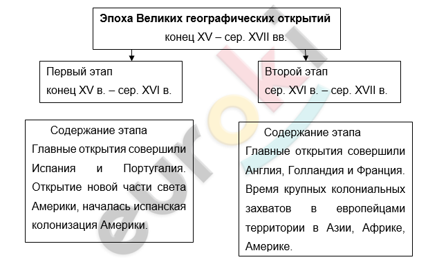 На мой взгляд, историки составили периодизацию Великих географических открытий в 2 этапа согласно тому, какие именно страны занимали лидирующее положение в данных открытиях. Первый этап – испано-португальский период, включающий открытие Америки, португальские плавания к Индии и берегам Восточной Азии и первое кругосветное плавание Магеллана. К середине XVI в. пиренейские державы, удовлетворенные захваченными источниками богатств, постепенно отказываются от новых исследовательских плаваний, стремясь прежде всего сохранить за собой уже приобретенные земли. Им на смену приходят Англия и немного позже Голландия. Начинается второй этап Великих географических открытий, основное содержание которого составили английские и французские открытия в Северной Америке, голландские открытия Австралии и Океании. Кроме того, различие между этапами состоит также в уровне развития колониальной системы в каждый период Великих географических открытий.