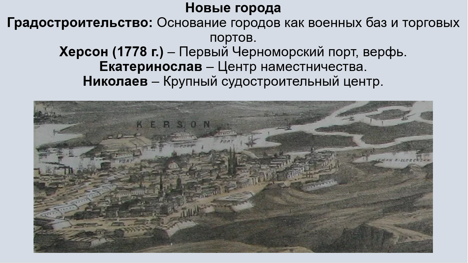 Добавить текст Вернуть оригиналОсвоение территории: Были созданы новые города (Херсон, Севастополь, Екатеринослав), военные базы и порты.