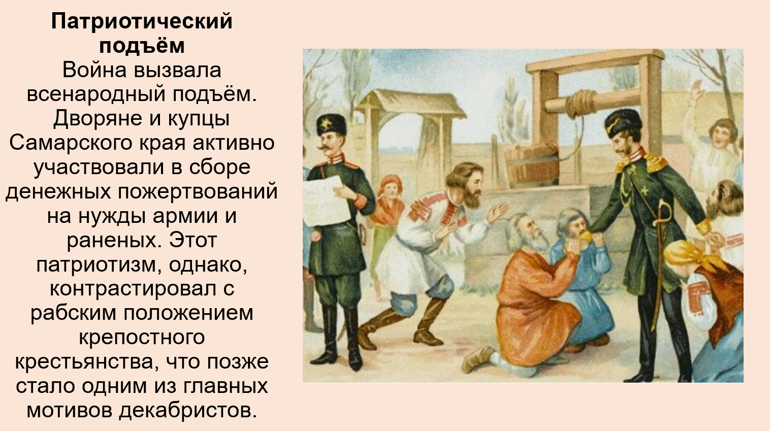 Добавить текст Вернуть оригиналПротиворечие патриотизма: Война 1812 г. пробудила чувство гражданского достоинства, и офицеры считали унизительным, что народ-победитель (крестьяне) остаётся в рабском положении.