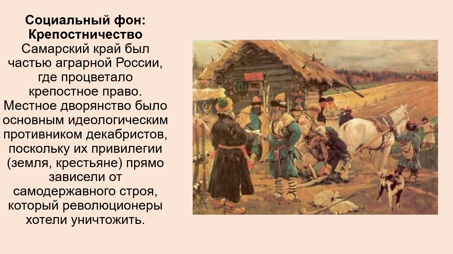 Дворянство Самарского уезда представляло собой ту консервативную социальную базу, на которую опиралось самодержавие. Это были помещики, чьи привилегии (включая крепостное право) декабристы намеревались уничтожить. В то же время, крестьяне Самарского уезда участвовали в рекрутских наборах и ополчениях 1812 года, что стало одним из источников гражданского самосознания, вдохновившего декабристов.