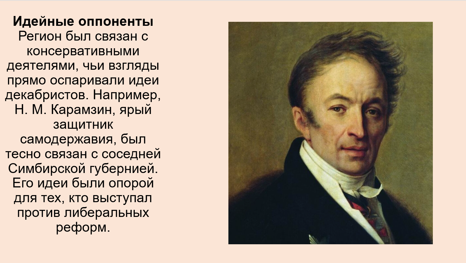 Хотя самих декабристов здесь не было, Самарский край был связан с идеологическими оппонентами движения. Например, историк и консерватор Н. М. Карамзин, чья «Записка о древней и новой России» решительно выступила против либеральных реформ, имел землевладельческие связи с соседней Симбирской губернией. Также А. А. Аракчеев, символ консерватизма и охранительных мер (таких как военные поселения), влиял на административную политику всего региона.