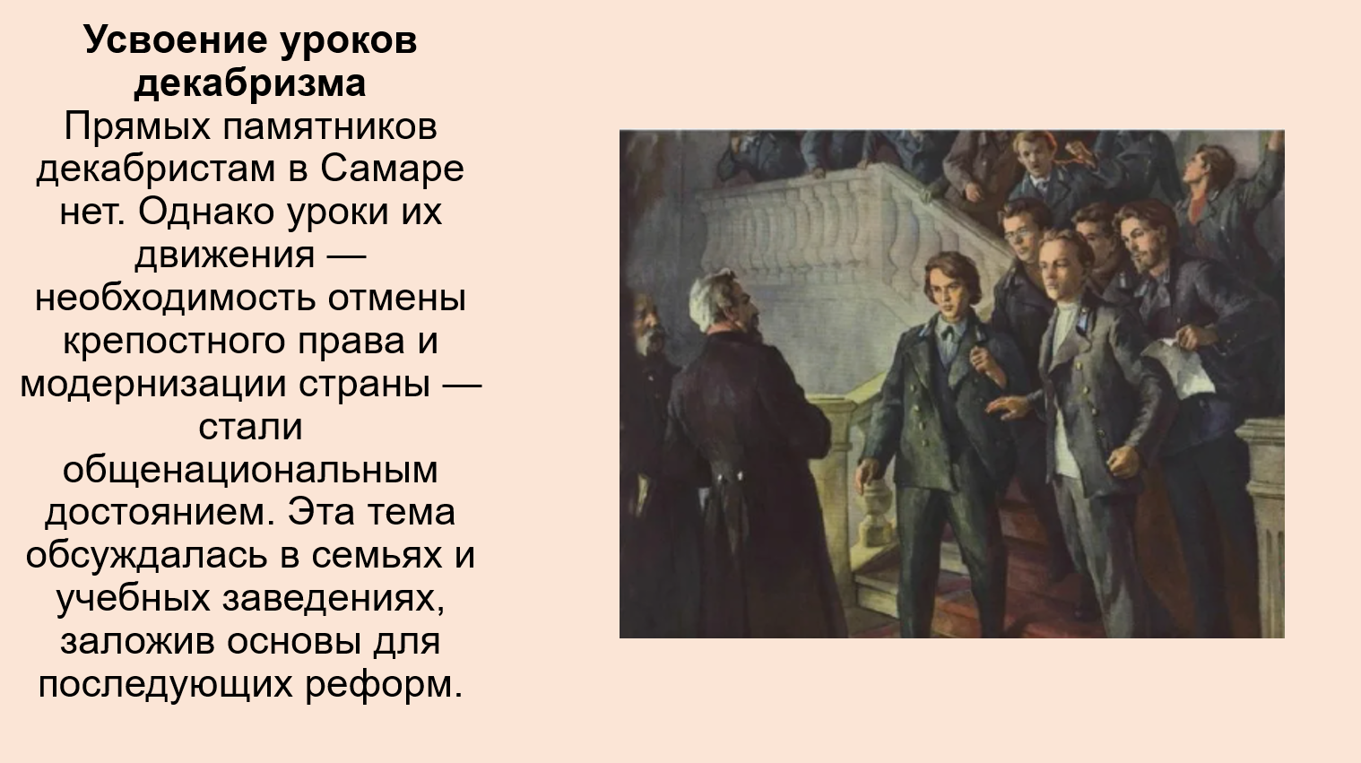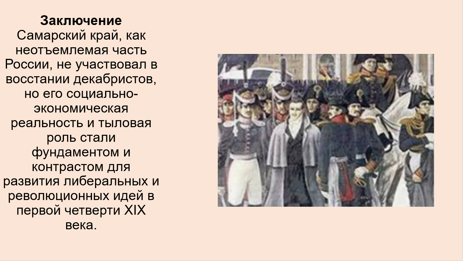 Таким образом, Самарский край был неотъемлемой частью России в первой четверти XIX века. Хотя он и не стал ареной для выступлений, социальные процессы (крепостничество), идеологические споры и последствия восстания (ужесточение режима) затронули его в полной мере. Движение декабристов показало, что, несмотря на удалённость, противоречия самодержавной России были общенациональными.