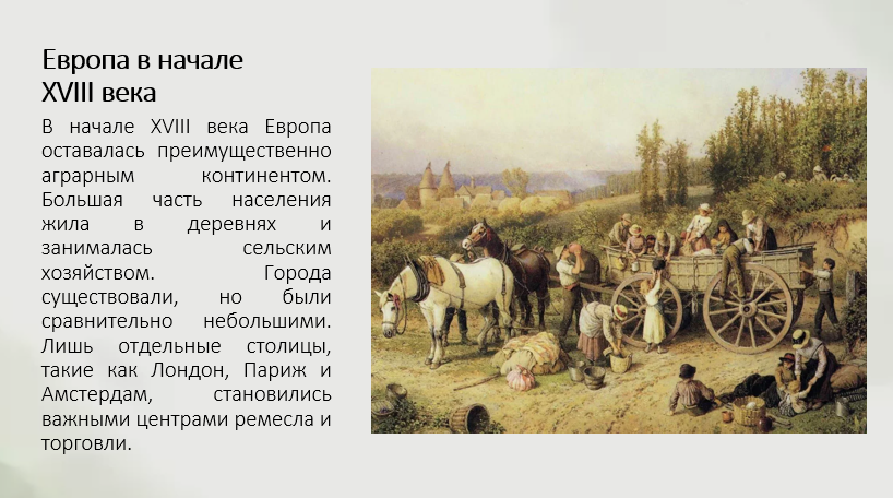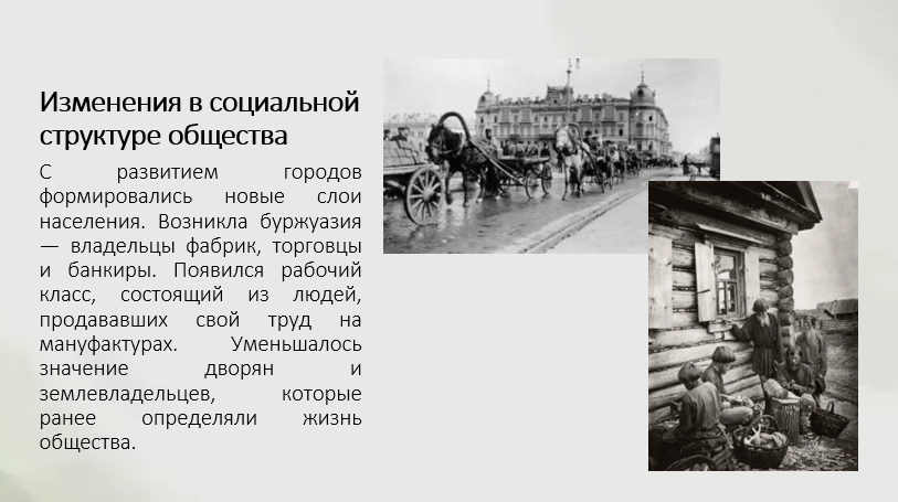Добавить текст Вернуть оригиналВ деревне и городе: В деревне по-прежнему преобладало сельское население, а в городах произошли изменения благодаря урбанизации — увеличилась численность городов и их роль. Крестьяне стали чаще покупать городские товары, а дома земледельцев стали перестраиваться по новой моде.