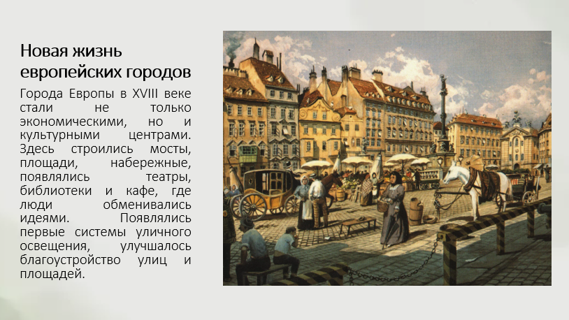 Добавить текст Вернуть оригиналМодернизация городской жизни: Рост городов (урбанизация) и стремление к рациональности вызвали изменения в облике городов: появились регулярное освещение, полиция, нумерация домов и новые кварталы с широкими улицами, что сделало городскую жизнь более безопасной и упорядоченной по сравнению с нерегулируемым хаосом прошлого.