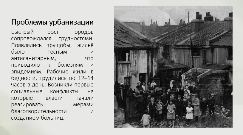 Добавить текст Вернуть оригиналРостом численности населения и урбанизацией: Крупные города (Лондон, Париж) приблизились к миллиону жителей, и это потребовало изменений.