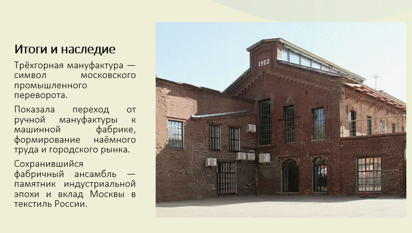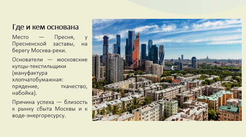 1. Начало промышленного переворота в России: причины и следствия. Используя дополнительные источники, подберите материал о создании и истории одного из известных российских промышленных предприятий, возникших в первой половине XIX в. (возможно, на территории вашего города, региона). Подготовьте презентацию об истории этого предприятия.