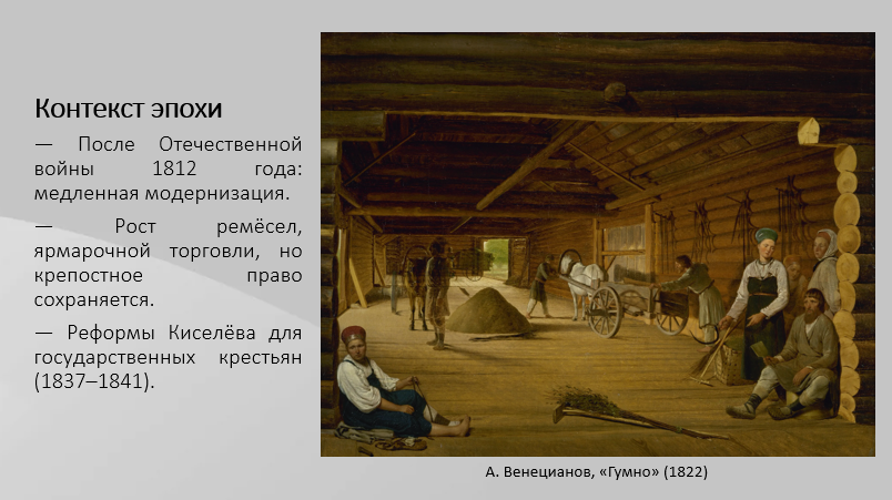 Добавить текст Вернуть оригиналОтечественная война 1812 года дала мощный импульс национальному самосознанию: тема родины, гражданского служения и исторической памяти стала осью искусства. Одновременно крепостничество и бюрократический произвол порождали сильный внутренний конфликт, который требовал художественного ответа. Из этого напряжения выросли гражданственность Пушкина, социальная сатира Гоголя, нравственная проблематика Лермонтова; в живописи — исторические полотна Брюллова и реализм передвижников, в музыке — национальная линия Глинки.