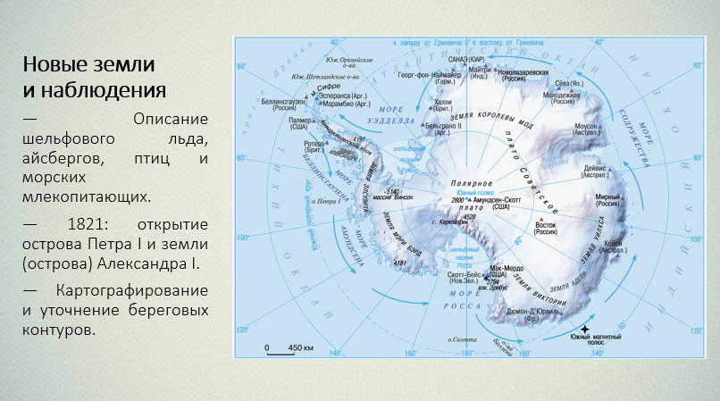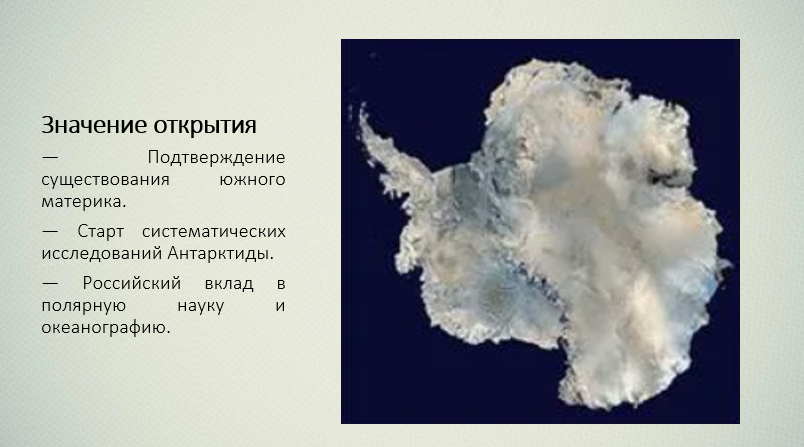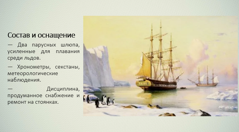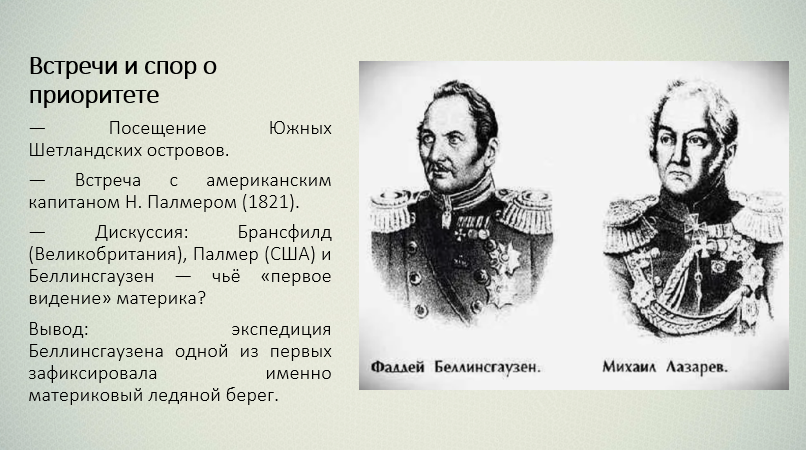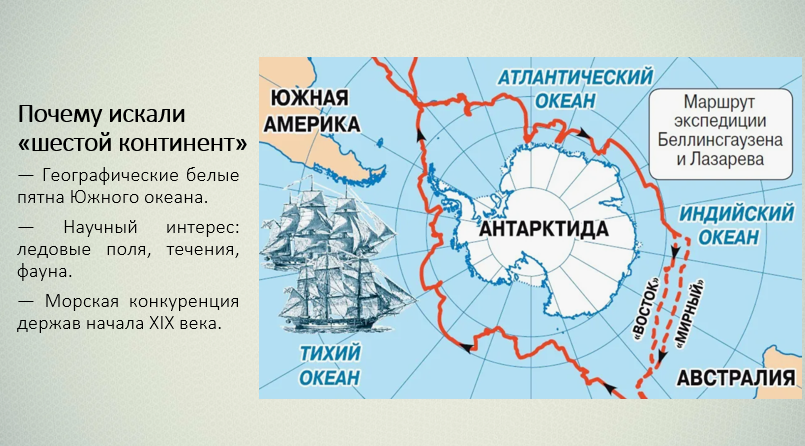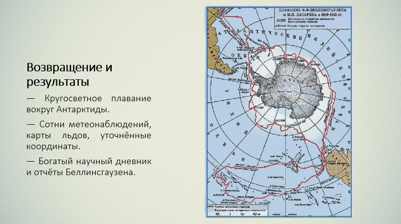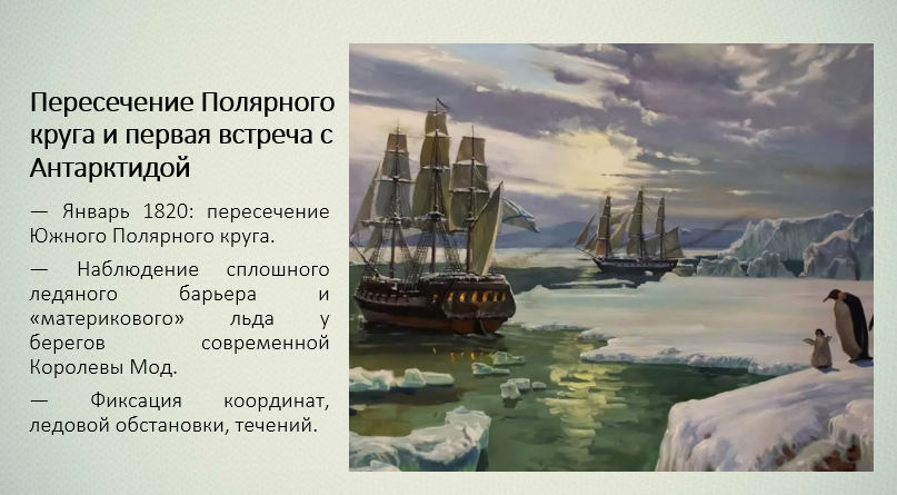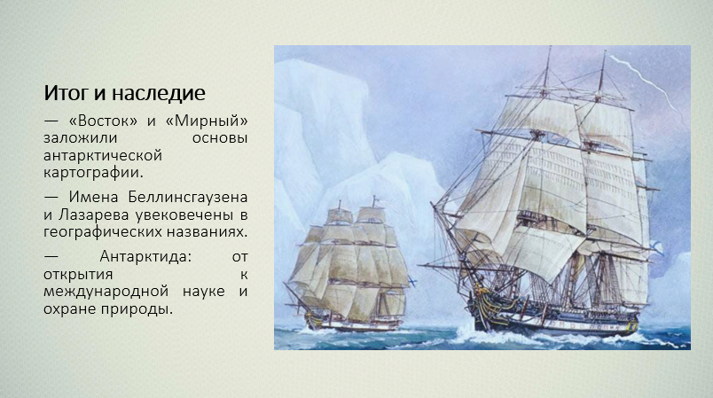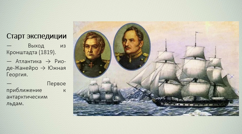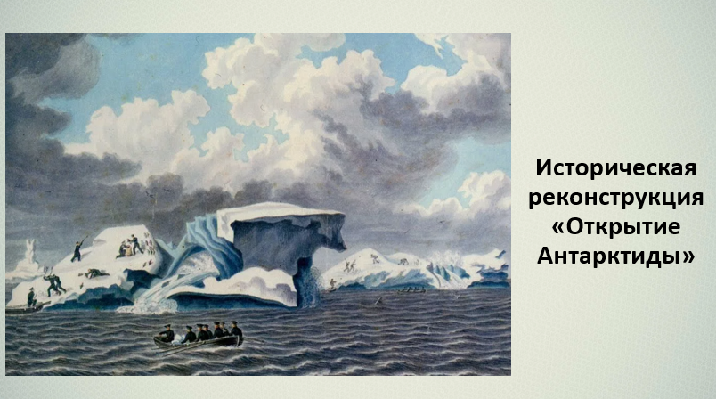2. Историческая реконструкция «Открытие Антарктиды». С помощью дополнительной литературы и Интернета изучите материал о плавании шлюпов «Восток» и «Мирный» под командованием Ф. Беллинсгаузена и М. Лазарева. Подготовьте презентацию, показывающую историю экспедиции и открытия Антарктиды.