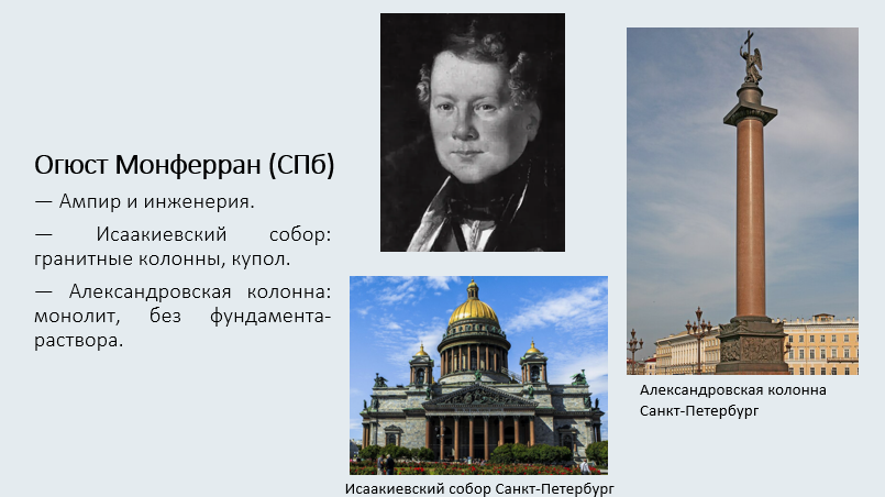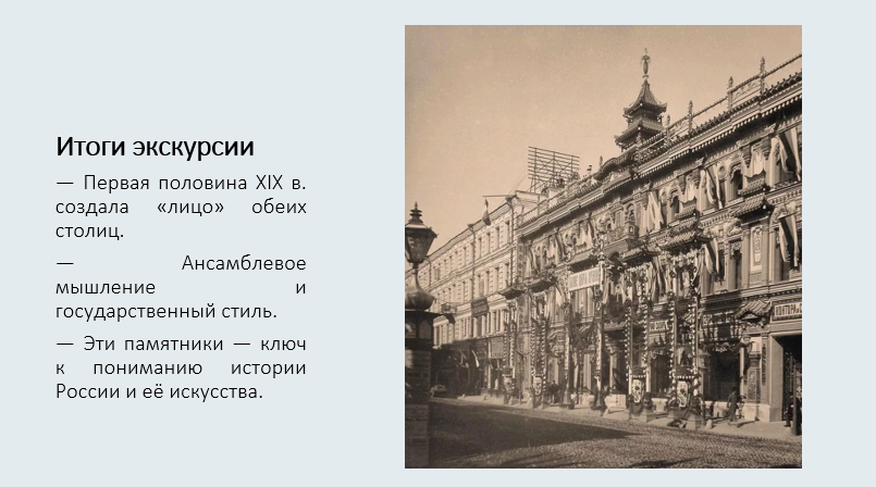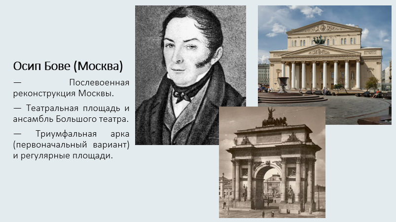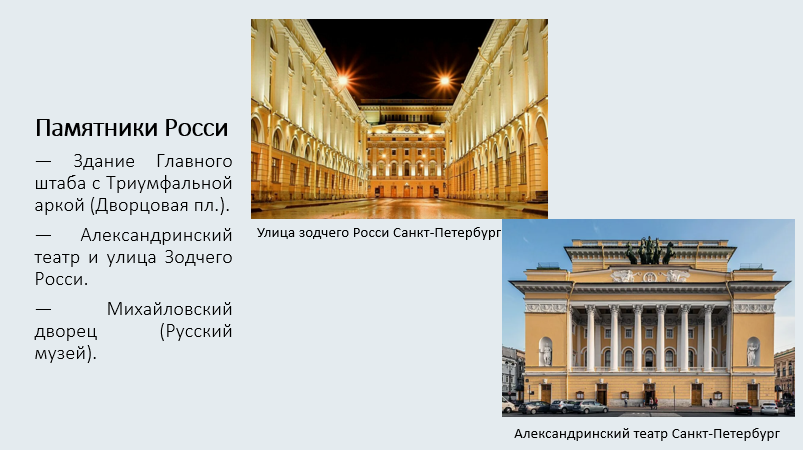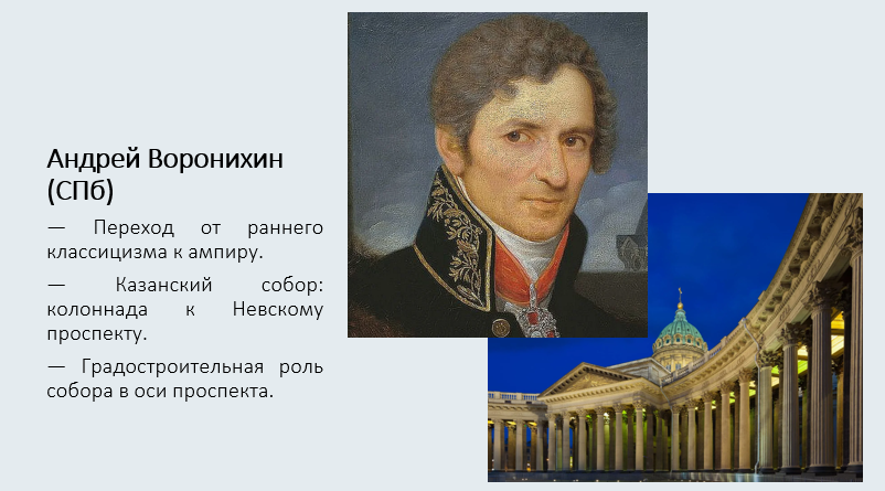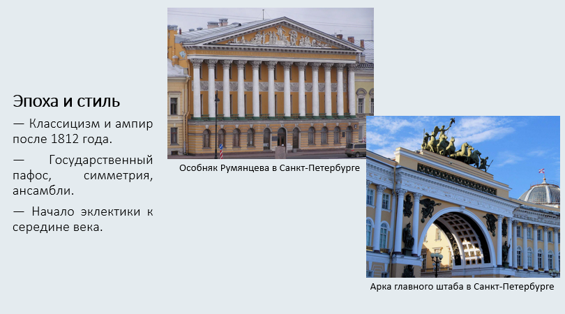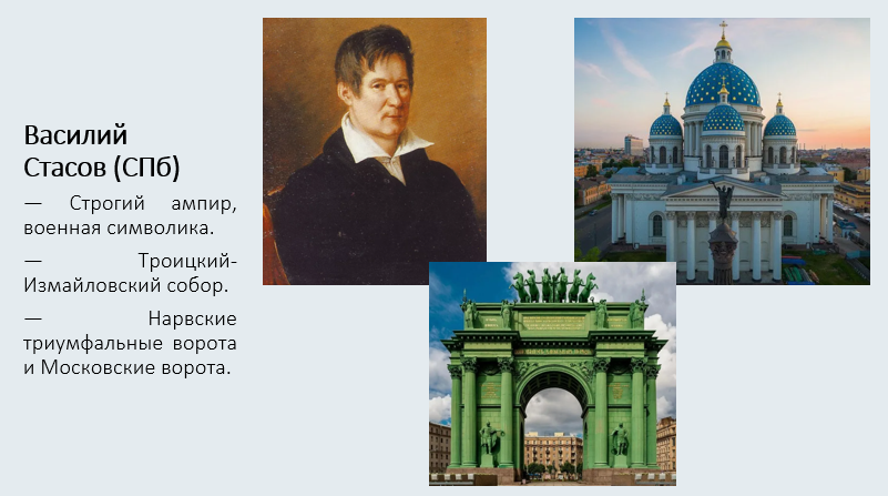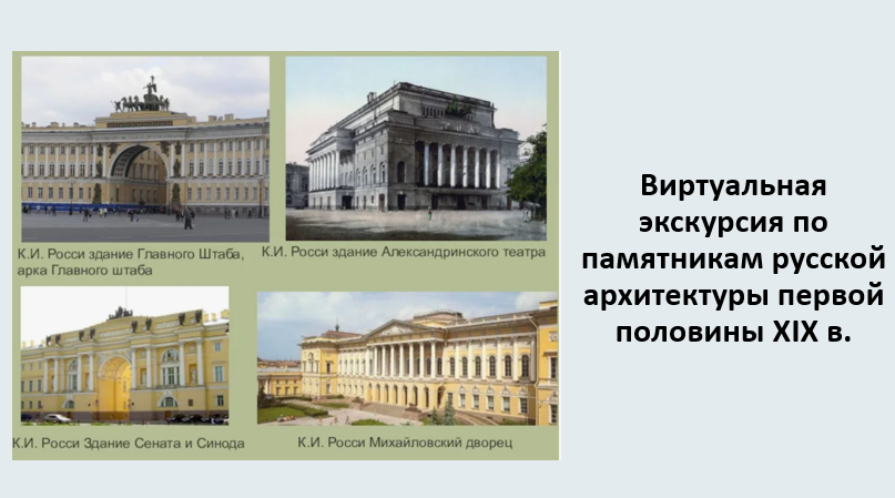 3. Виртуальная экскурсия по памятникам русской архитектуры первой половины XIX в. Данный период является одним из ключевых в истории русской архитектуры. С помощью дополнительной литературы и Интернета подберите материалы о творчестве 4-5 известных зодчих, описания и изображения ключевых памятников архитектуры первой половины XIX в. На основе собранных материалов подготовьте презентацию-экскурсию для одноклассников.