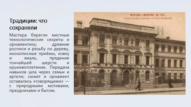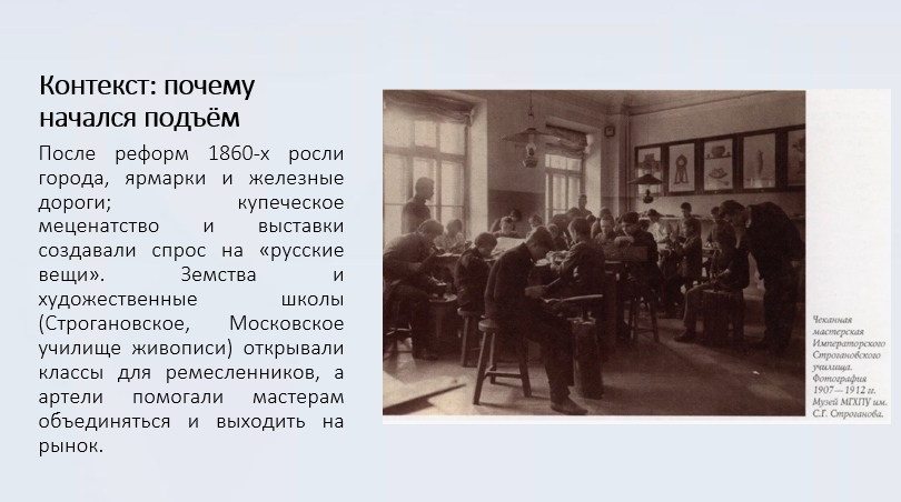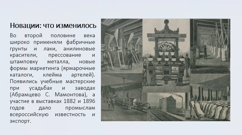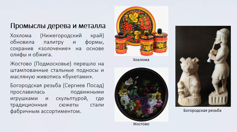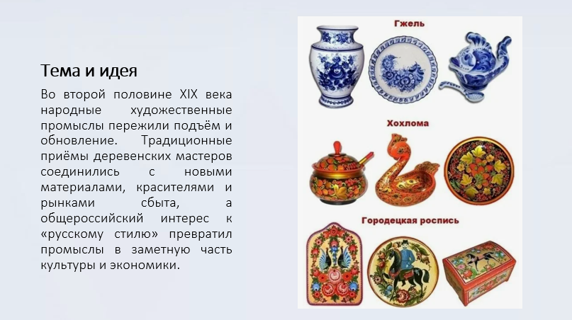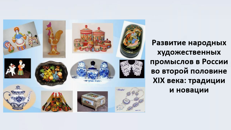 Добавить текст Вернуть оригинал8. Создайте электронную презентацию (не менее пяти слайдов) «Развитие народных художественных промыслов в России во второй половине XIX в.: традиции и новации». Выступите с ней перед одноклассниками.