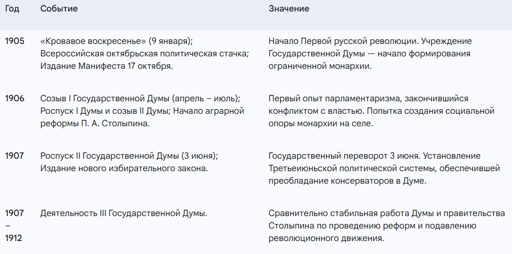 Добавить текст Вернуть оригиналТрансформация политической системы (от абсолютизма к дуалистической монархии): В результате Первой русской революции абсолютизм был ограничен, и в стране возникли элементы парламентаризма (Государственная Дума, легальные политические партии).
