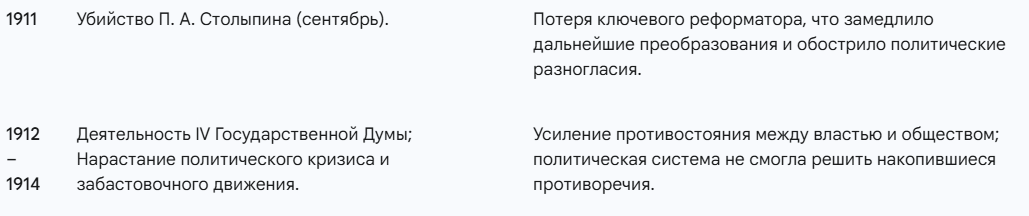 Добавить текст Вернуть оригиналУсиление национализма и кризис: В конце периода (1912–1914 гг.) наблюдалось обострение социальных и политических противоречий, рост националистических настроений и нарастание внешней конфронтации, что привело к вступлению России в Первую мировую войну.