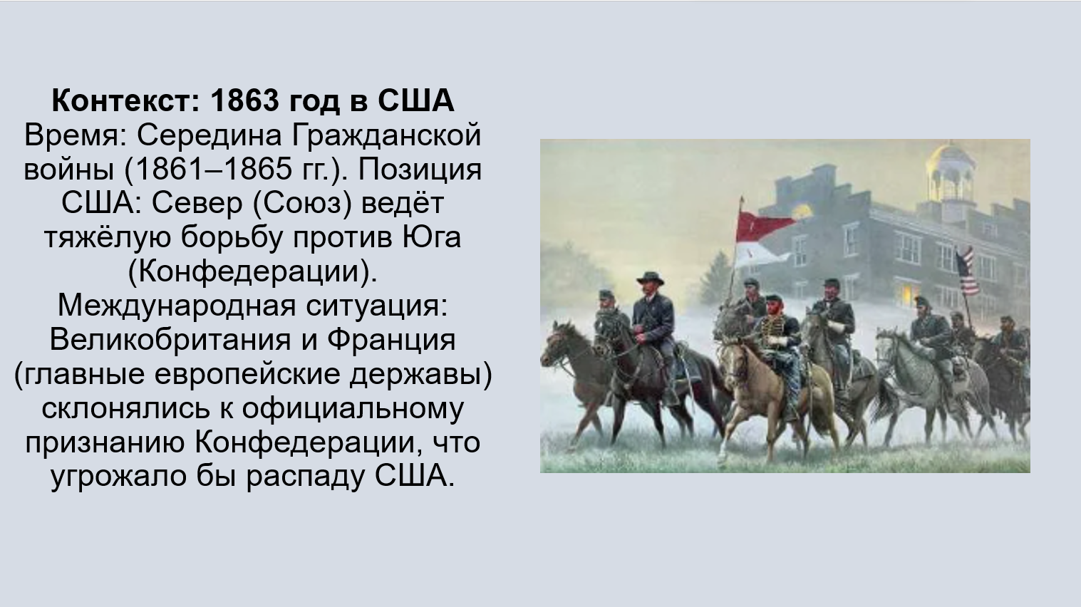 Цели «Прокламации»: «Прокламация» не означала полную и повсеместную отмену рабства, а преследовала конкретные политические цели: объявление свободными рабов только на мятежных территориях (Юг), что должно было подорвать экономику Юга и привлечь негров на сторону Севера.