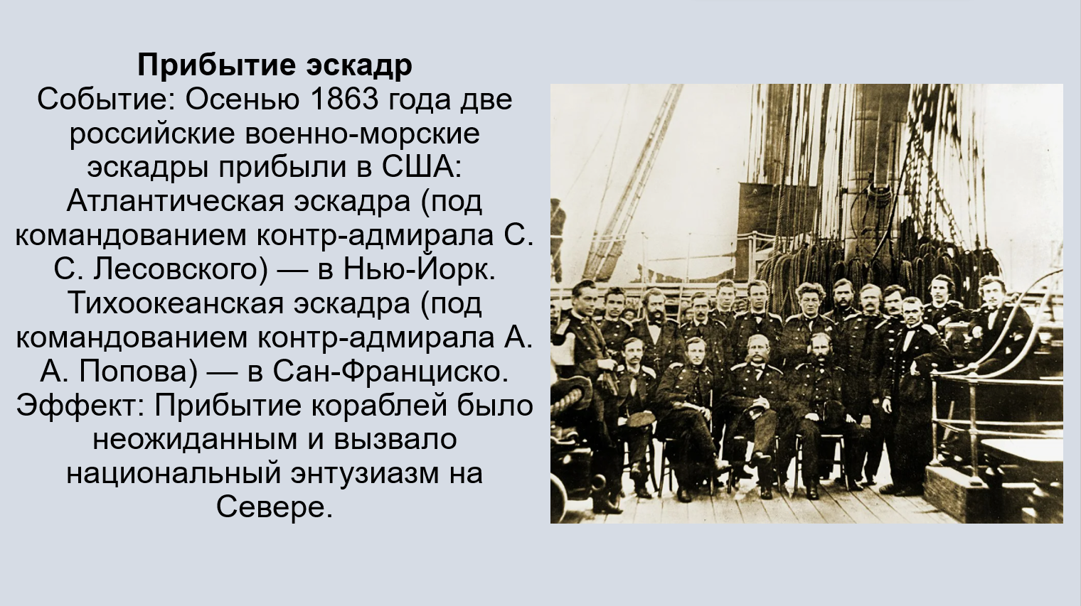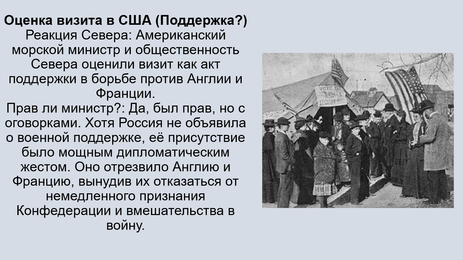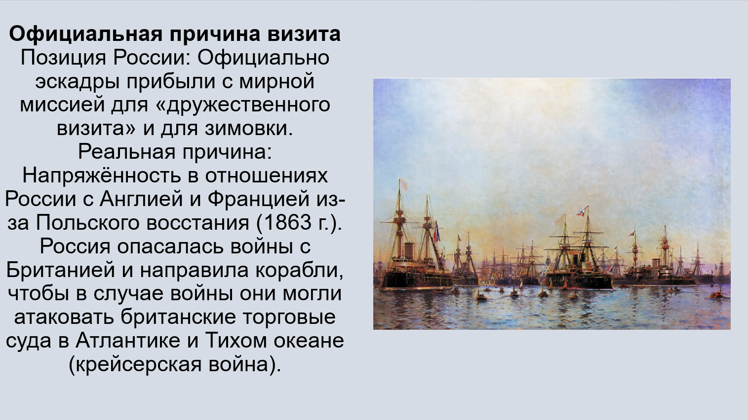 5. Увидев на рейде Нью-Йорка в 1863 г. российские корабли, американский морской министр записал в дневнике: «Господь, благослови русских!» Подготовьте презентацию, в которой выясните, как и почему они там оказались и прав ли был министр, оценивая это как поддержку.