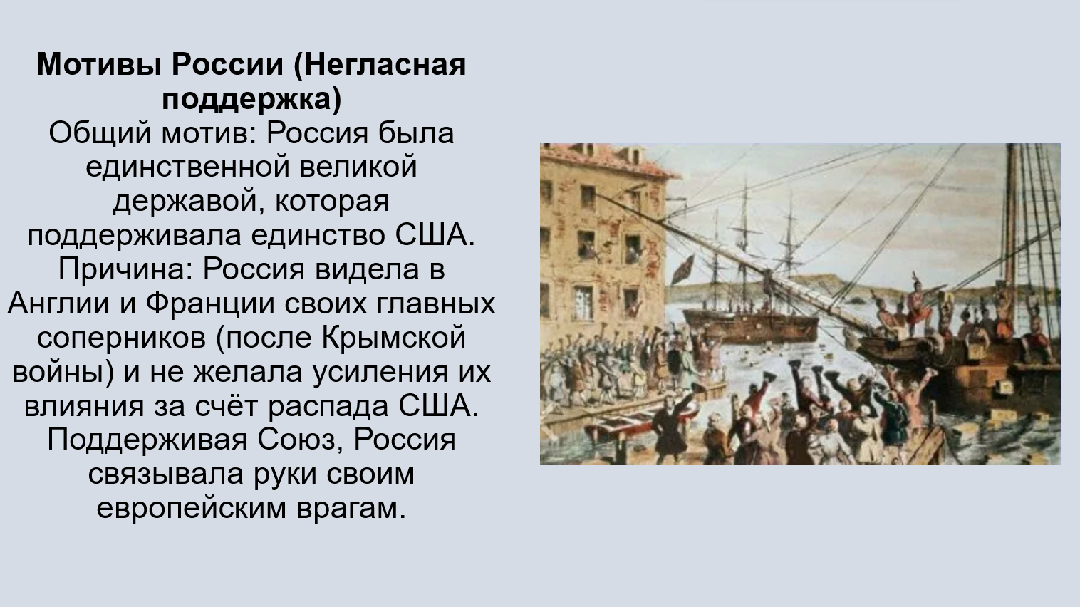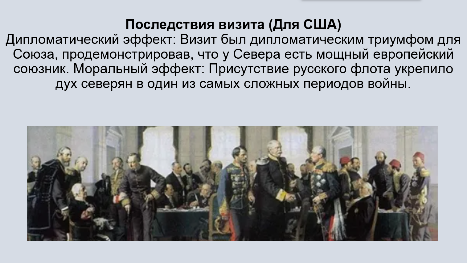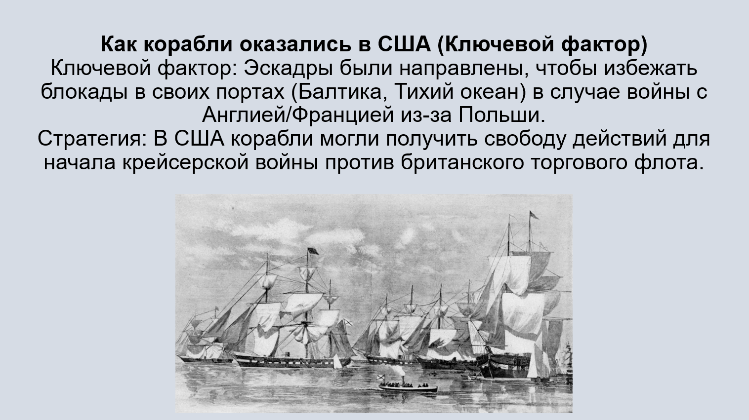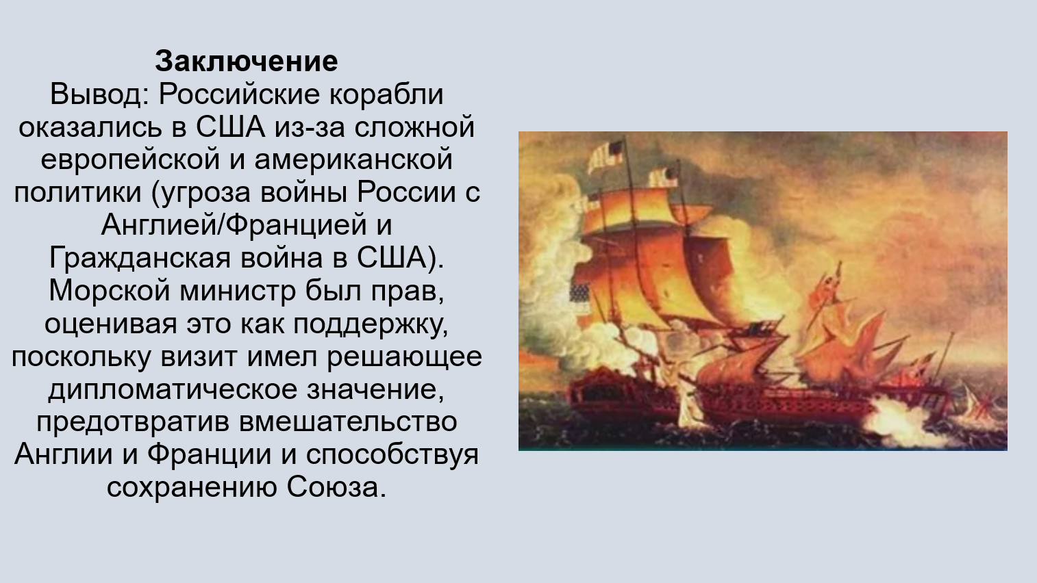 5. Увидев на рейде Нью-Йорка в 1863 г. российские корабли, американский морской министр записал в дневнике: «Господь, благослови русских!» Подготовьте презентацию, в которой выясните, как и почему они там оказались и прав ли был министр, оценивая это как поддержку.
