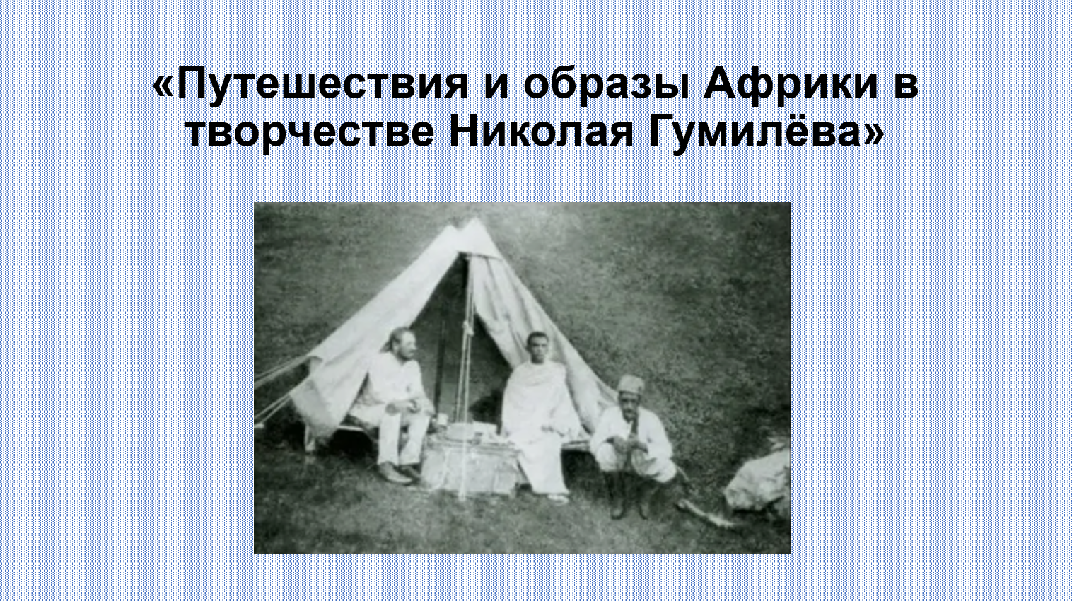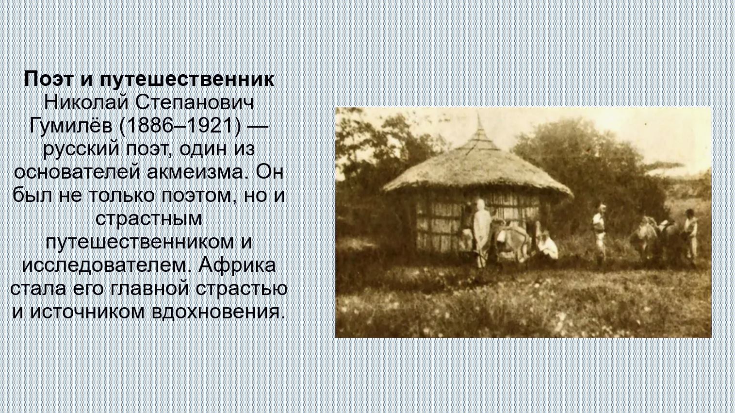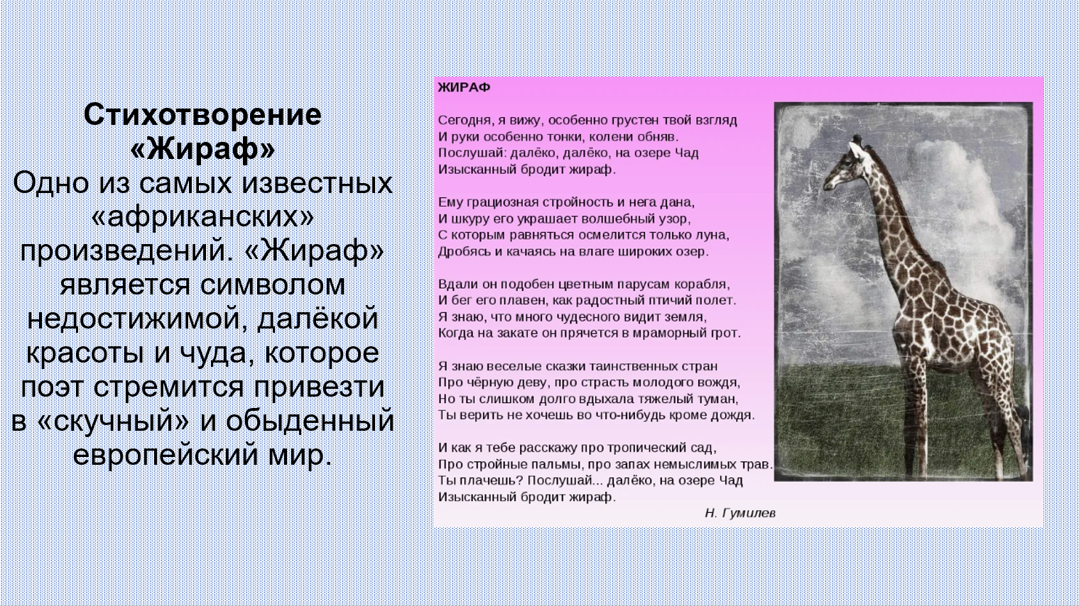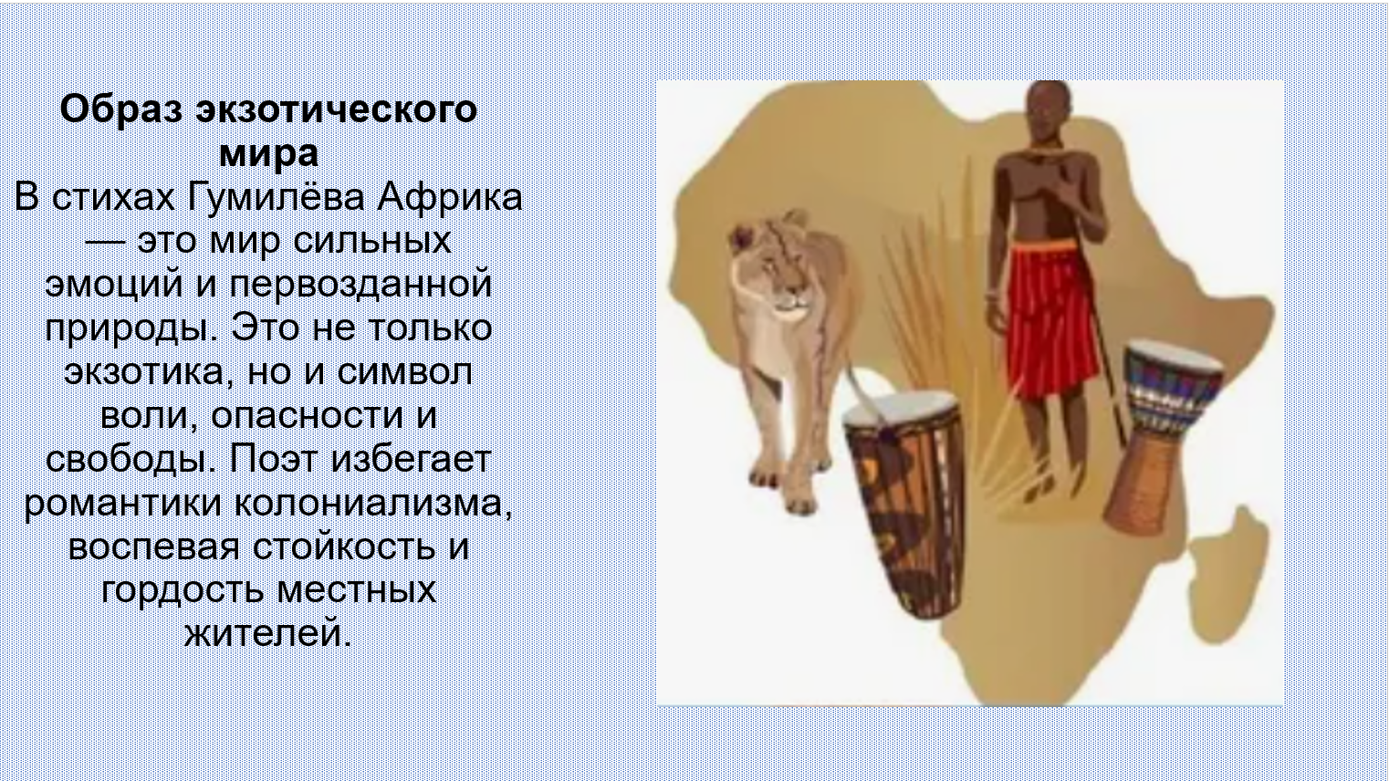 Добавить текст Вернуть оригинал6. В числе первых исследователей Африки среди российских учёных был русский поэт Н. Гумилёв. Подготовьте презентацию по его произведениям на тему «О тебе, моя Африка...», посвящённую путешествиям по Африканскому континенту.